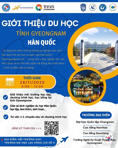 - Giới thiệu môi trường học tập, chương trình học & học bổng tại tỉnh Gyeongnam – trung tâm công nghiệp lớn của Hàn Quốc và là tỉnh kết nghĩa với Đồng Nai;