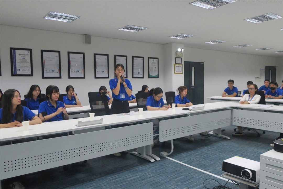 Sinh viên đã có cơ hội tiếp cận môi trường làm việc quy mô lớn, chuyên nghiệp và hiện đại của YKK – doanh nghiệp nổi tiếng toàn cầu trong lĩnh vực sản xuất khóa kéo và phụ kiện may mặc. Chuyến đi mở đầu bằng việc giới thiệu tổng quan về lịch sử, văn hóa doanh nghiệp và hệ thống vận hành của công ty.
