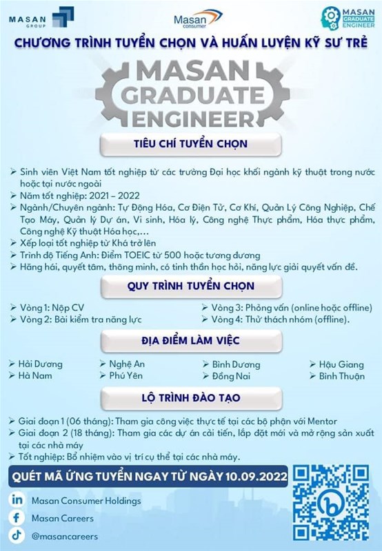 Khu vực tuyển dụng: Các nhà máy của Masan tại Hải Dương, Hà Nam, Nghệ An, Bình Dương, Đồng Nai, Hậu Giang, Phú Yên, Bình Thuận.