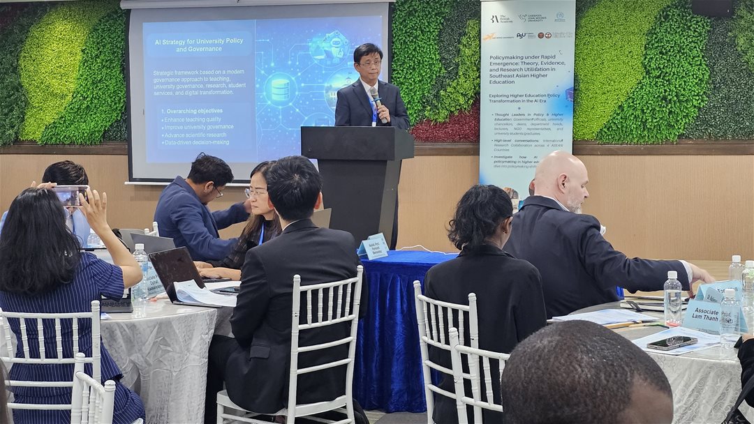 PGS.TS. Lâm Thành Hiển, Hiệu trưởng Trường Đại học Lạc Hồng, trình bày tham luận với chủ đề “AI Capacity Building for Policy and Governance” (Tăng cường năng lực AI cho hoạch định và quản trị chính sách) tại hội nghị.