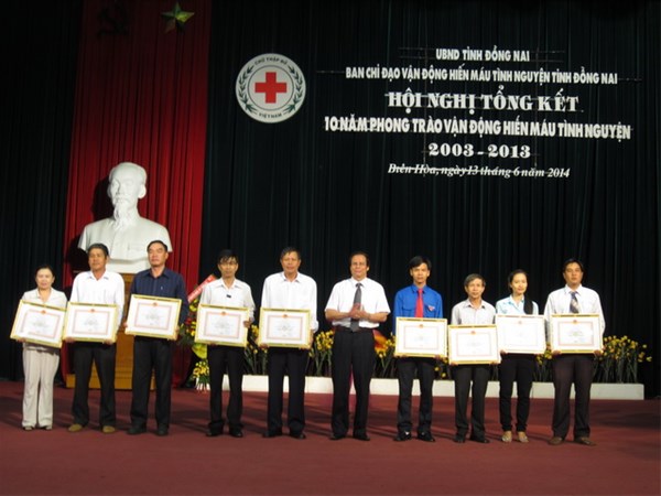 Dong Nai province’s Steering Committee of the Voluntary Blood Donation Campaign on June 13 held a ceremony to review blood donation movement 2003 - 2013 period, at the Provincial Convention and Events center. Representatives of Southern region's Red Cross Association, leaders of Dong Nai People's Committee, Red Cross Association and blood donors attended the ceremony.